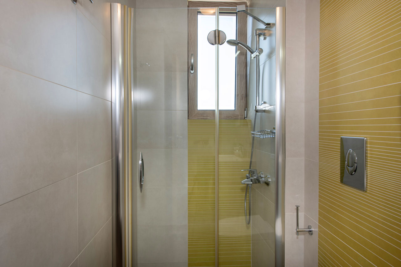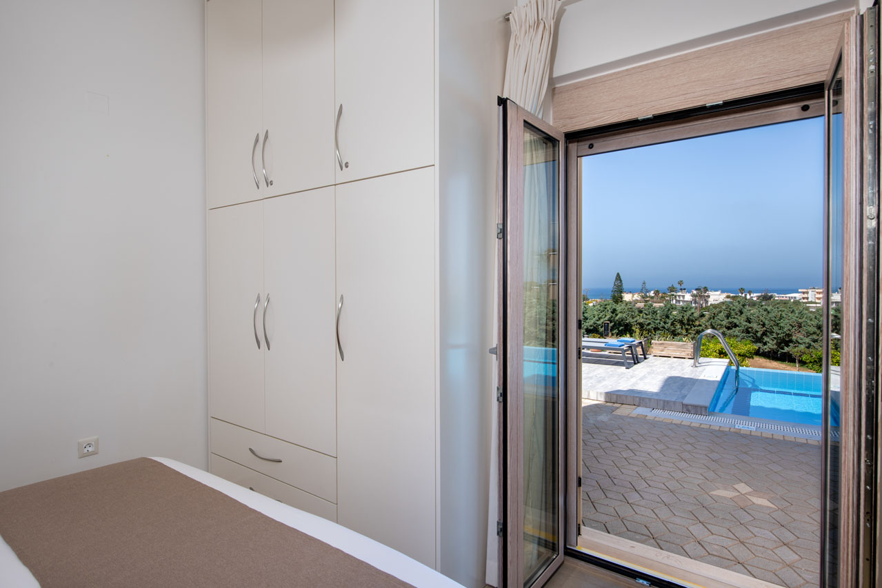 On the ground floor, there is a bright living area with HD smart TV, a DVD player and a music system. A chic dinning area is opposite a spacious kitchen, which is fully equipped to allow you to prepare anything you wish for you and your company. All common areas have direct access to the pool, the garden, the terraces and the villas’ parking space. On the ground floor you will also find two of the villas’ bedrooms and one bathroom.