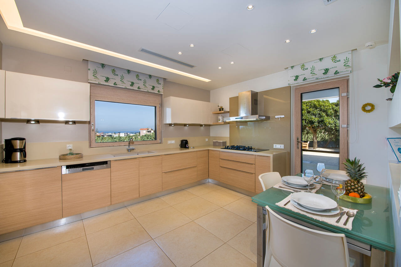 The villa is built on a plot of 2400 sq.m, overlooking the Cretan sea and landscape with its olive groves, herbs and mountains. It’s exceptional external area offers a large infinity pool viewing the sea, specious terraces with sunbeds, parasol, trees’ shadings and fine furniture. The pool can be heated upon request in advance. You will also find a basketball hoop and 5 seats parking space. The villa is gated all around offering privacy and security for relaxing days and nights with your company.